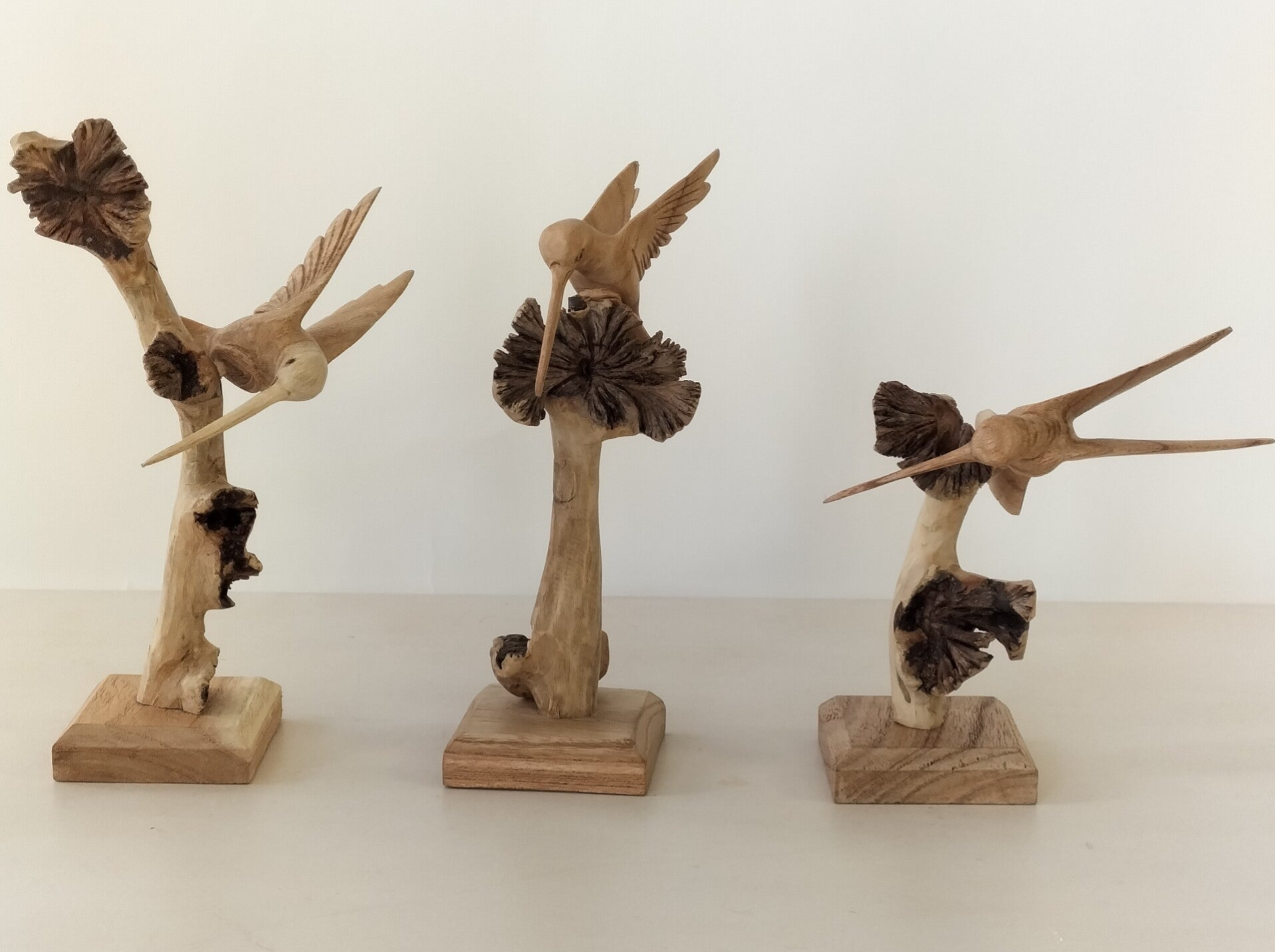 Tafeltjes, vogelhuisjes, olifanten, paddenstoelen, fijn gesneden kolibri's en wanddecoraties.