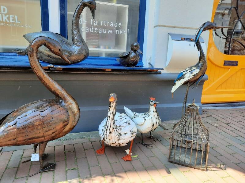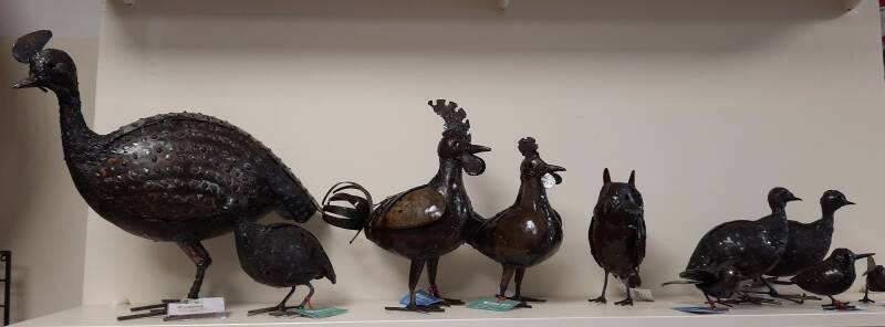Uit Zimbabwe wordt veel scrap metal geïmporteerd door drie bedrijven: Afrikan dit bedrijf zit in Harfsen en bij Zimba Arts en Gone Arty kopen we in via het inkoopcentrum in Culemborg. Het zijn allemaal unieke, prachtige producten gemaakt van gebruikt metaal (schroot) en soms wit gekleurd (als er een koelkast is gebruikt) en we hebben altijd een ruim assortiment op voorraad. Dit kunnen o.a. vogels, bloemen, vlinders, waterbekkens op een ijzeren pin zijn, maar ook grote vogels zoals zwanen, ganzen, reigers of kippen. En soms een stokstaartje, wrattenzwijn, geit, reekalf, schaapje of vogelkooitje. Ook kleinere dieren staand of hangend zoals bijvoorbeeld mussen, ijsvogels, sprinkhanen of muisjes. Voor een klein of een groot bedrag: we hebben volop keuze!